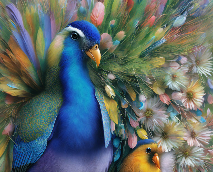 A vibrant scene featuring colorful birds nestled among lush greenery and delicate pink flowers. The vivid blues, greens, and yellows of the birds create a lively, enchanting atmosphere.
