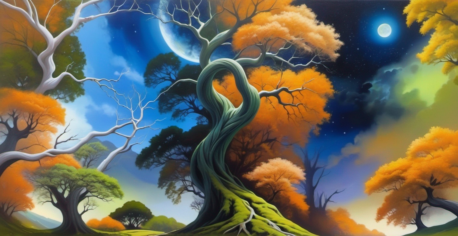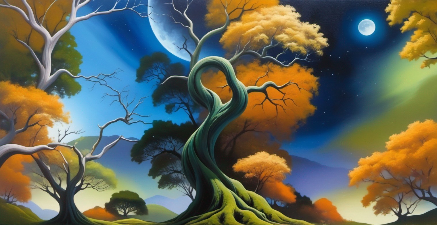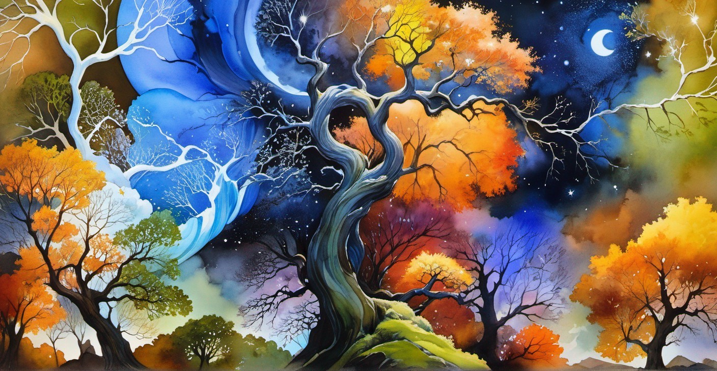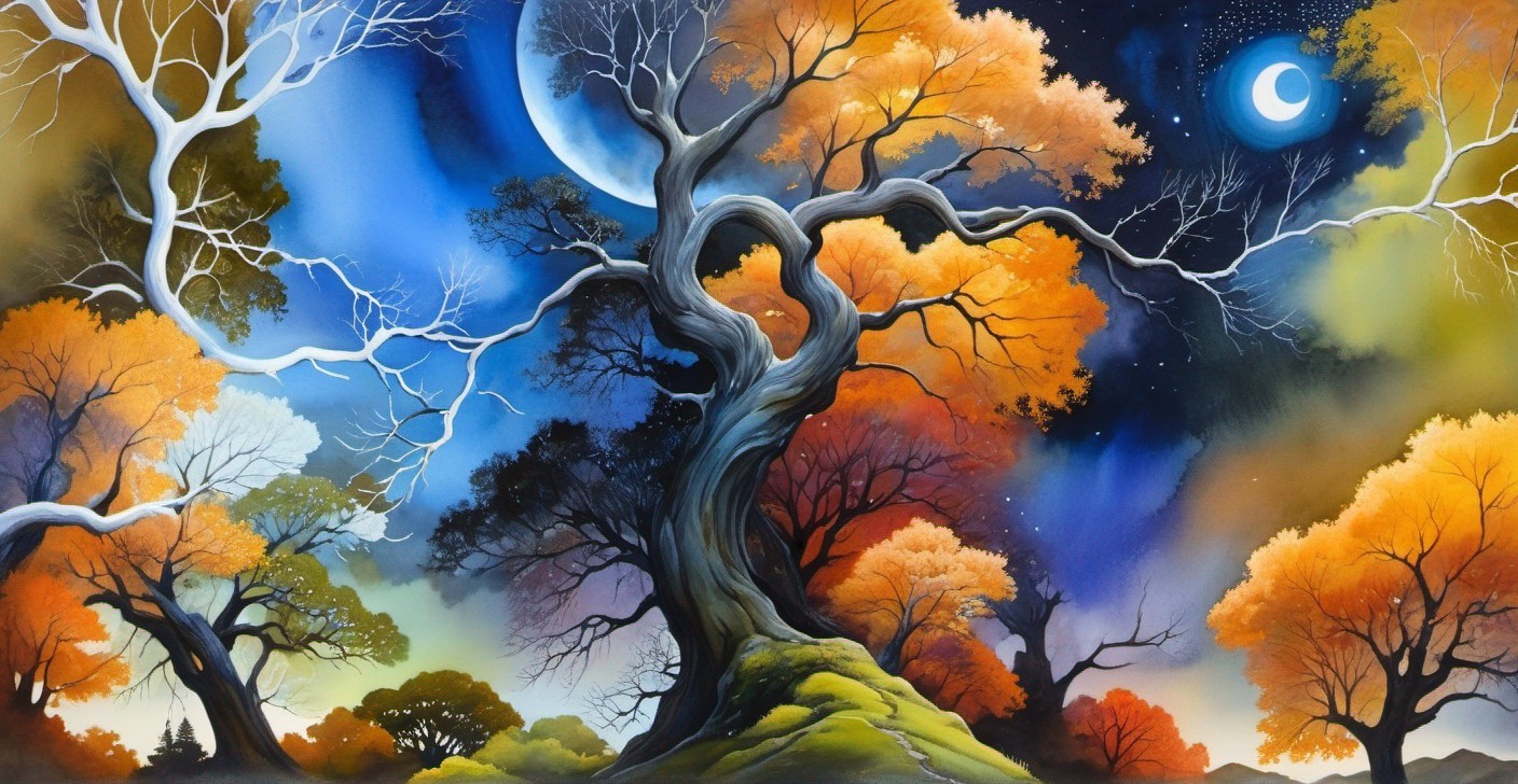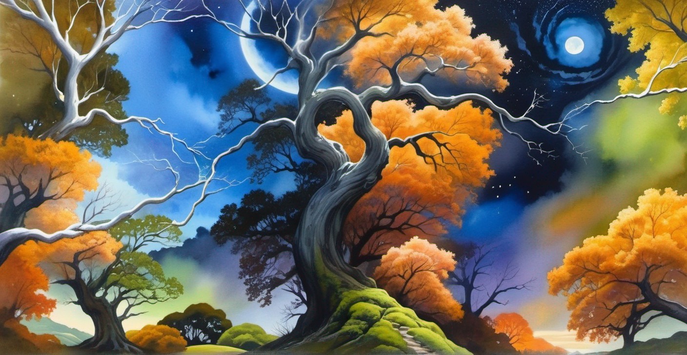 + Prompt:whimsical watercolor, Epic cinematic breathtaking intricate insanely detailed painting of dramatic storm clouds, dark night and bright moonlight glow on an aesthetic remarkable old white oak tree, river, winding path, mountains, pale blue and white