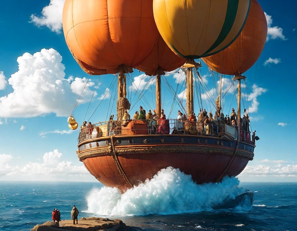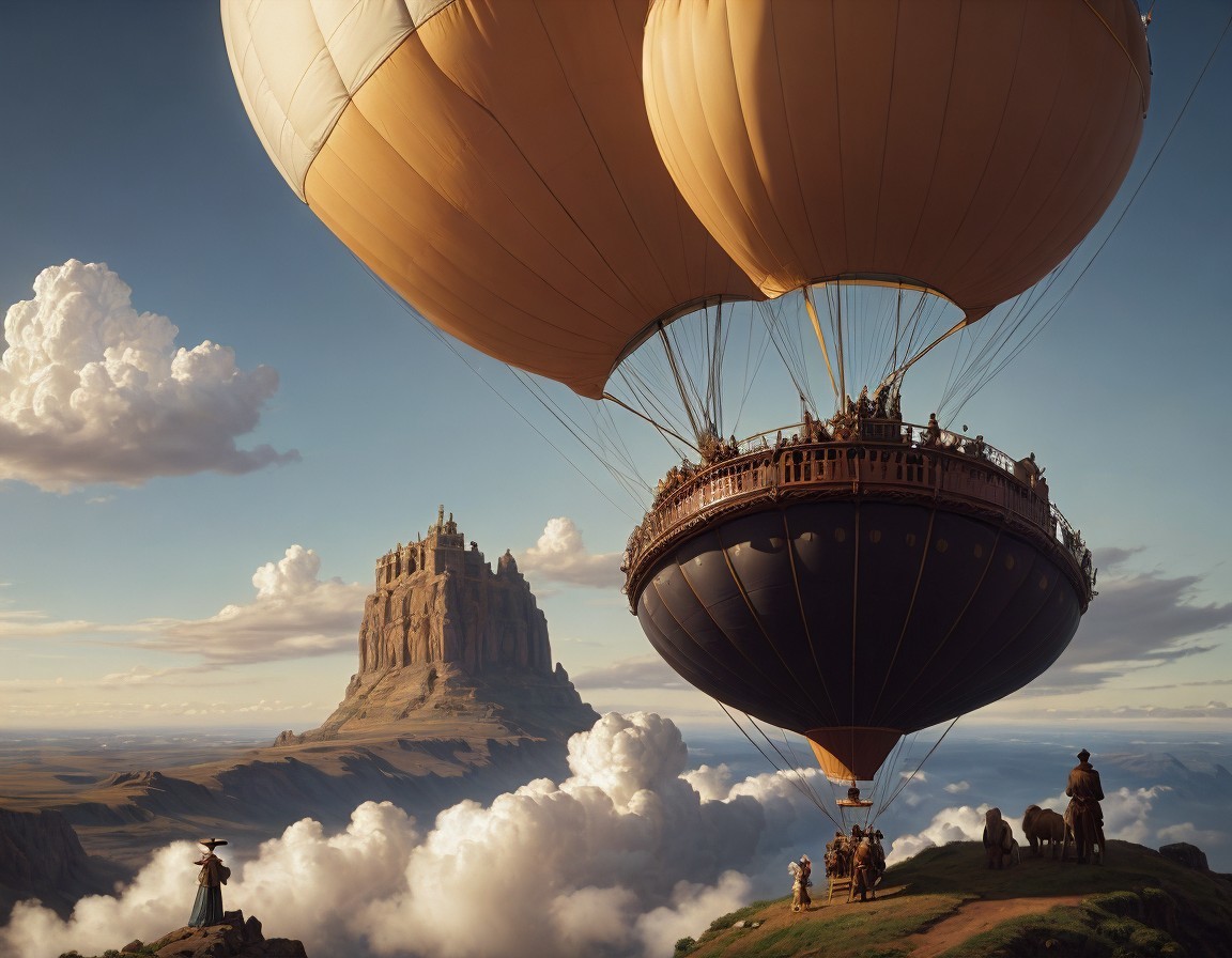 Prompt: A kind of Jules Verne adventure, a 16th century ballon traveling with explorers over the african continent, a wonderful morining and majestic sky with some clouds, sun rays. Below there are rivers and animals. All the scene is a top perspective.