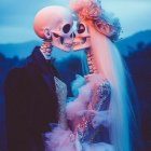 Two eerie yet elegant figures with intricately designed skull masks stand by a serene body of water. Their shimmering outfits and floral accents create a striking contrast against the natural backdrop.