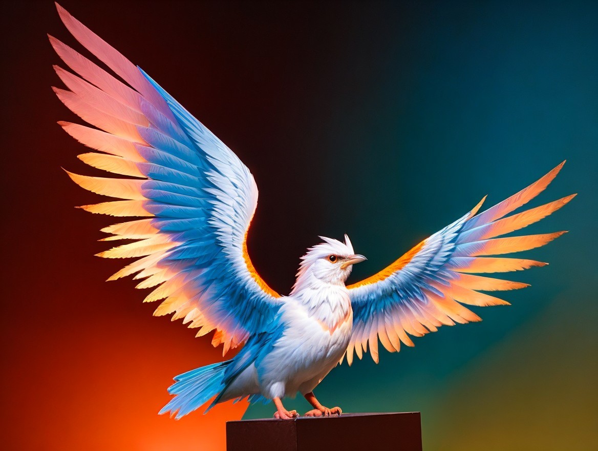 A vibrant, mythical bird with rainbow-colored feathers spreads its wings wide amidst a lush, colorful forest backdrop, exuding a sense of majesty and wonder. A smaller bird perches nearby.