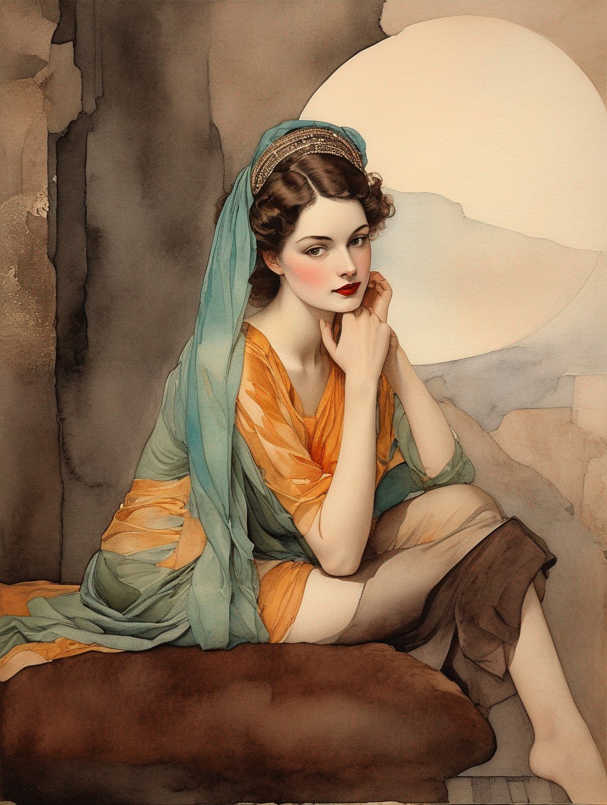 Prompt: Beautiful woman in the style of WALTER MARTIN BAUMHOFER and rené gruau whimsical, beautiful, poignant, touching. soft watercolor extra water in Art Deco by Annigoni, Egon Schiele, Milo Manara, Botticelli, Catrin Welz-Stein, Jean Metzinger, Klimt, perfect eyes, perfect hands face , highly detailed, complementary colors, hyper detailed. Watercolor and ink splatter, dynamic pose,