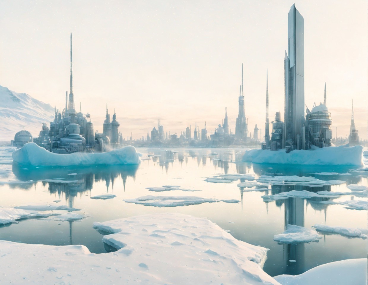 Futuristic buildings in serene frosty landscape