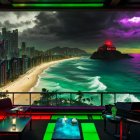 A modern interior features a grand piano and stylish chair, framed by large windows showcasing a vibrant city skyline and beach at sunset, with colorful floors adding a playful touch.