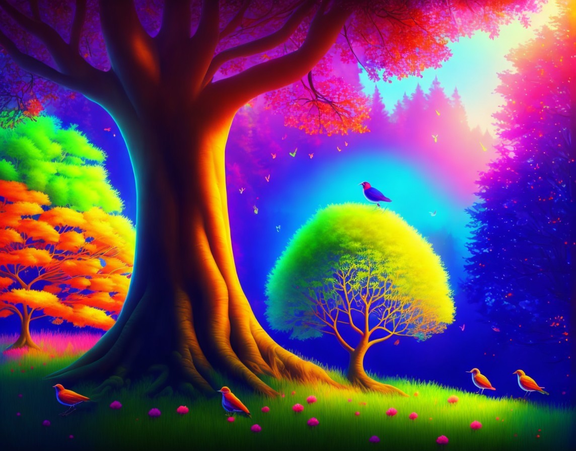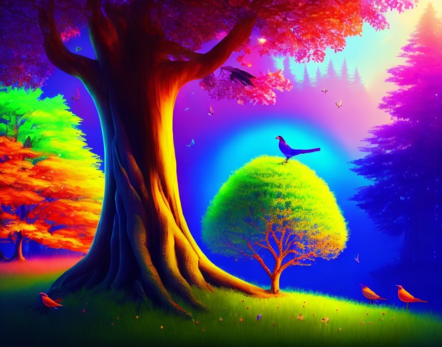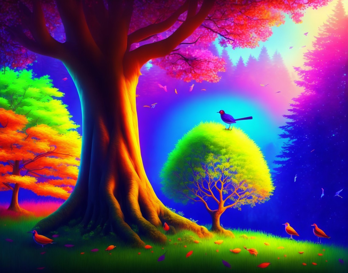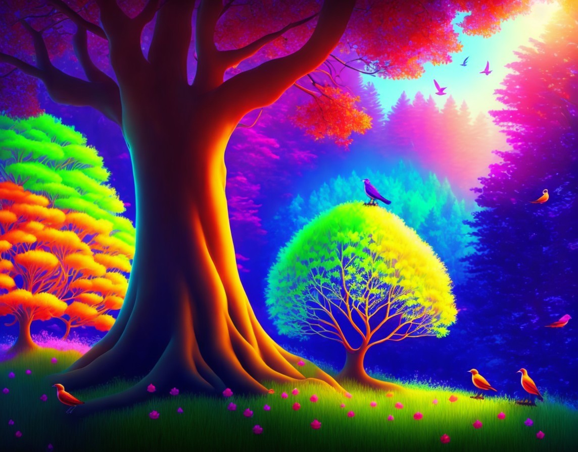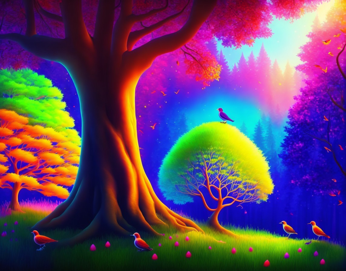 A vibrant forest with neon-colored trees, glowing foliage, birds, and ethereal light beams piercing the purple-blue sky.