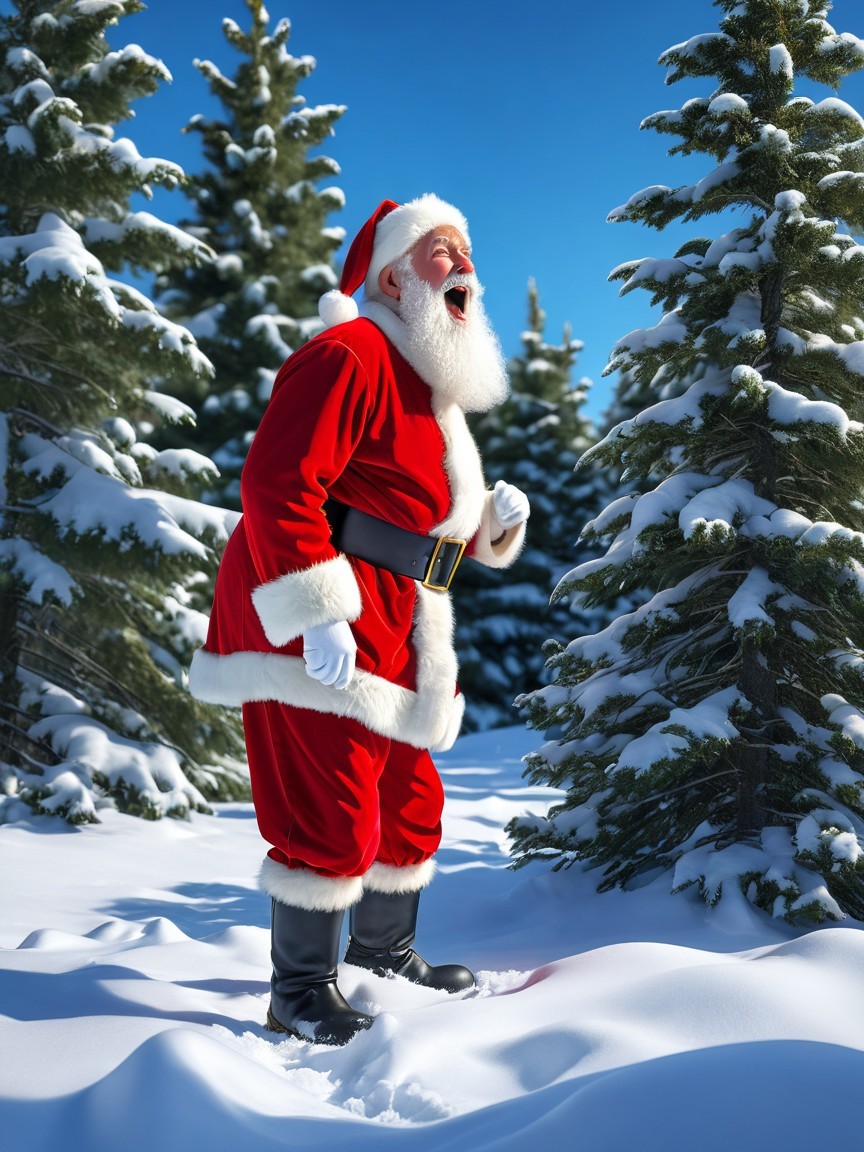 A jolly Santa Claus stands in a snowy forest, surrounded by evergreen trees. His red suit contrasts beautifully with the white snow, capturing the festive spirit of winter.