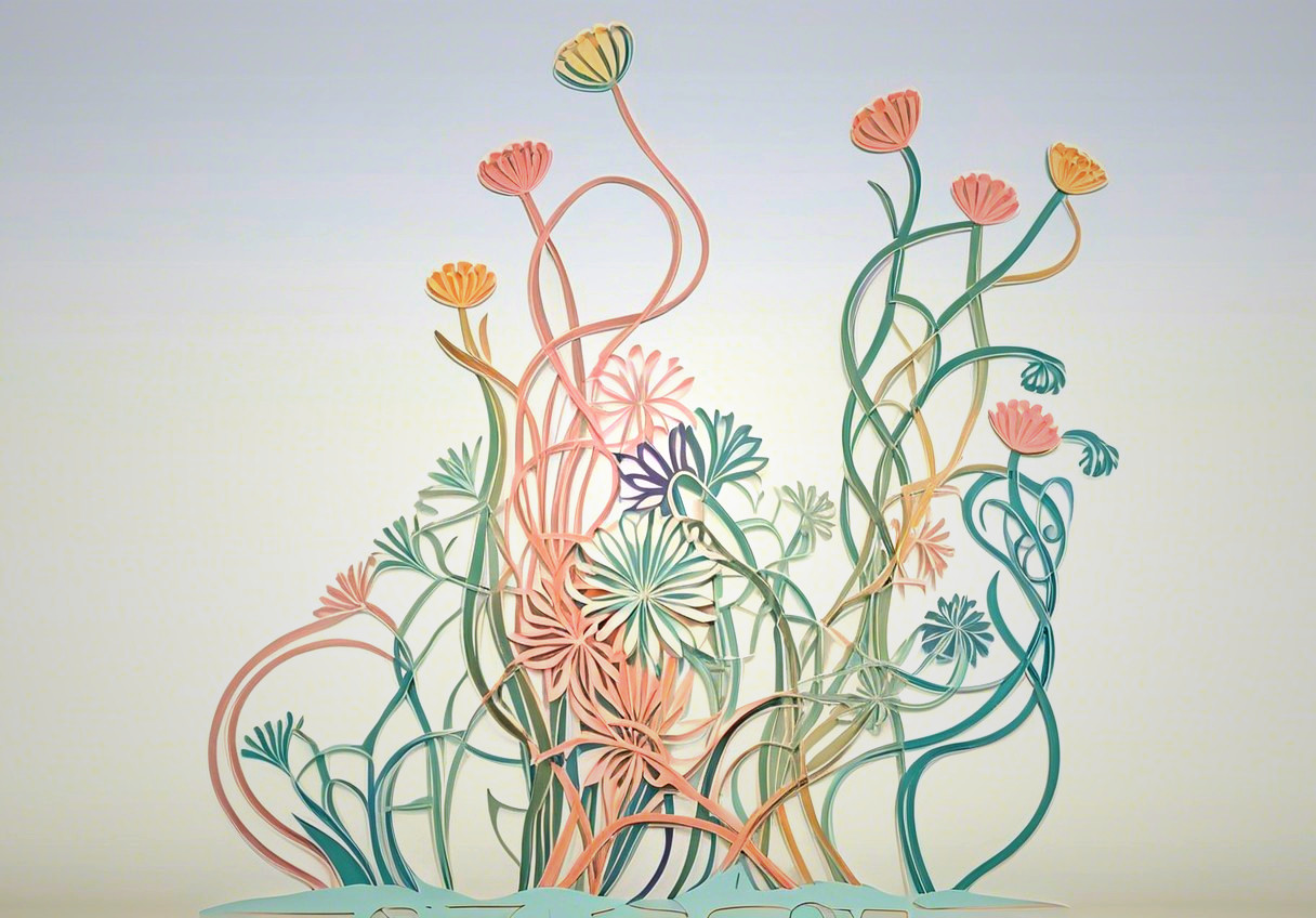 + Prompt:Line art, paper cutout style with shadows, Abstract plant arrangement in pastel colors, simple flowers and winding stalks, inspired by William Morris