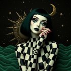 A striking figure in a form-fitting, dotted black and white bodysuit, featuring vivid makeup with bold colors. The backdrop is a surreal pattern, creating an avant-garde atmosphere.