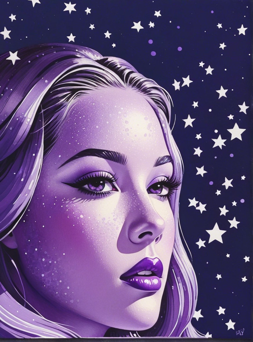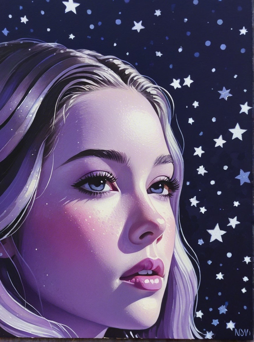 Prompt: Stylized gouache painting by noma bliss, close-up, splaahy, stylized headshot, stacked-up perspective, dreamy enchantress with stippled hair, metallic sparkling features,vivid illumination,warm rim light, bokeh effects, soft diffused lighting, otherworldly psychpomp scene, american gothic 1.7, softened edges, juvenile, beautiful, cel-shaded, somber, pale complexion 1.4,, retrofuturistic, groovy, hues and shades of lavender and pale grey, dark luminosity, acrylic ink, only curves, hatching, purple scratchings, expired film, tessellated, tiny brush strokes, chromatic induction, vector 9:5, dynamic lighting casting raytraced shadows, dark atmosphere, reminiscent of Overton Loyd, unique aesthetic, otherworldly, back-lit, pop art painting reference, stylization with stacked-up perspective by nicoletta Ceccioli and Maxfield Parrish, watercolor and ink, colorful portrait in front of starry sky, created in patchwork style by Aubrey Bear, reminiscent of abstract art: smooth, impasto tempera, scouring rush, purple loosestrife, reflections, misty, pen and ink in warm tones, three-point lighting, wavery, contouring bold strokes, plasticity effect, detailed, dramatic lighting, pen and ink style of Overton Loyd,.serene, warm color palette, precise Gelsculpt, luminism, intricate details, calm blotting paint, softened rounded edges, high detail, brushed textures in simplistic style, squiggly storybook illustration art by Overton Loyd, tints of freda people and edward Hopper, 1970s advertising art merged with pencil sketch, matching, stacked-up perspective, symmeteical, Beautiful artwork, 3 point light reflections, filigree, wispy artistic precision of ho baron, watercolor and ink extrusion, golden ratio, simplistic color scheme, squiggly, softly colored, american gothic 1.7, parallax occlusion 1.2, octane render, coloring by William Bradley, subtle coloring 1.9, traumacore 1.2, overall composition by Georgia o'keffee, vfx, uhd, hdr, brushed Pastel Colors.