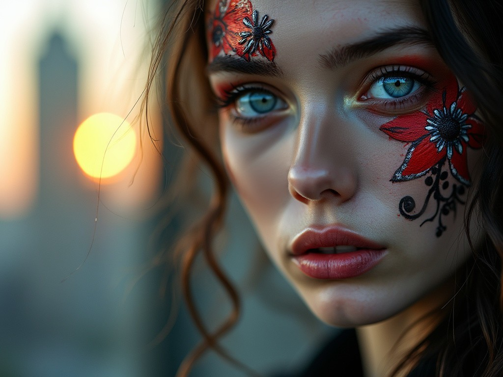 A close-up portrait of a young woman with striking blue eyes and intricate red floral face paint, set against a dreamy sunset backdrop that enhances her captivating expression.