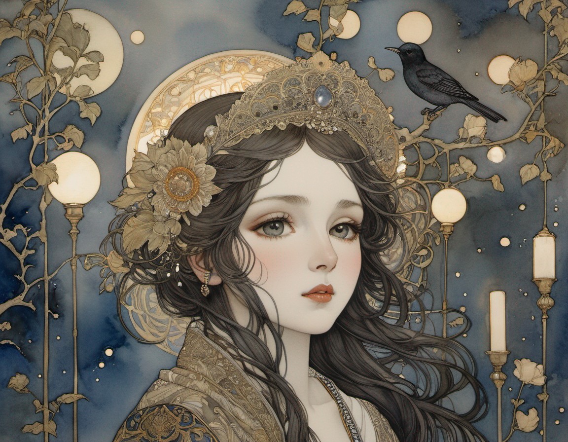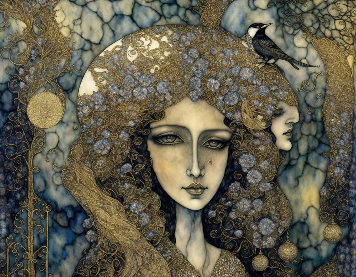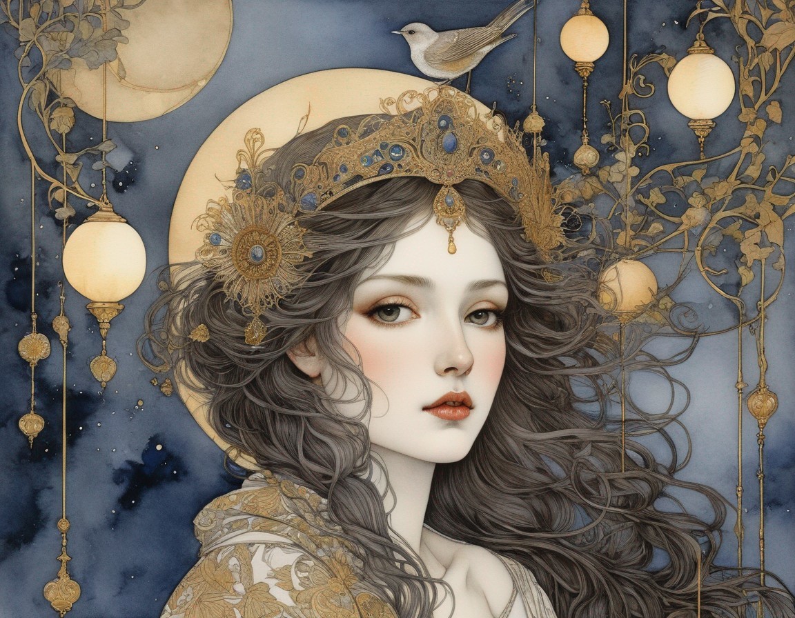 An artwork depicting a woman with flowing hair, adorned with gold jewelry and flowers, surrounded by birds against a starry background.