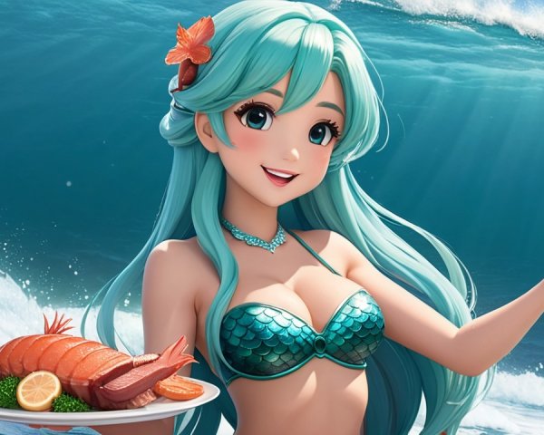 A charming anime character enjoys a vibrant sunrise, wearing a colorful strapless swimsuit. Her joyful expression and playful pose capture the essence of summer and adventure by the beach.
