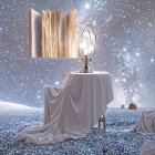 A minimalist setup features a sleek table draped in white fabric, topped with an elegant, glowing vase. Behind it, the word "FLUX" shines brightly against a starry backdrop.