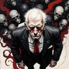 A pale figure in a suit stands against a dark background, surrounded by floating skulls and pink tree branches. The striking contrast emphasizes a haunting and dramatic atmosphere.