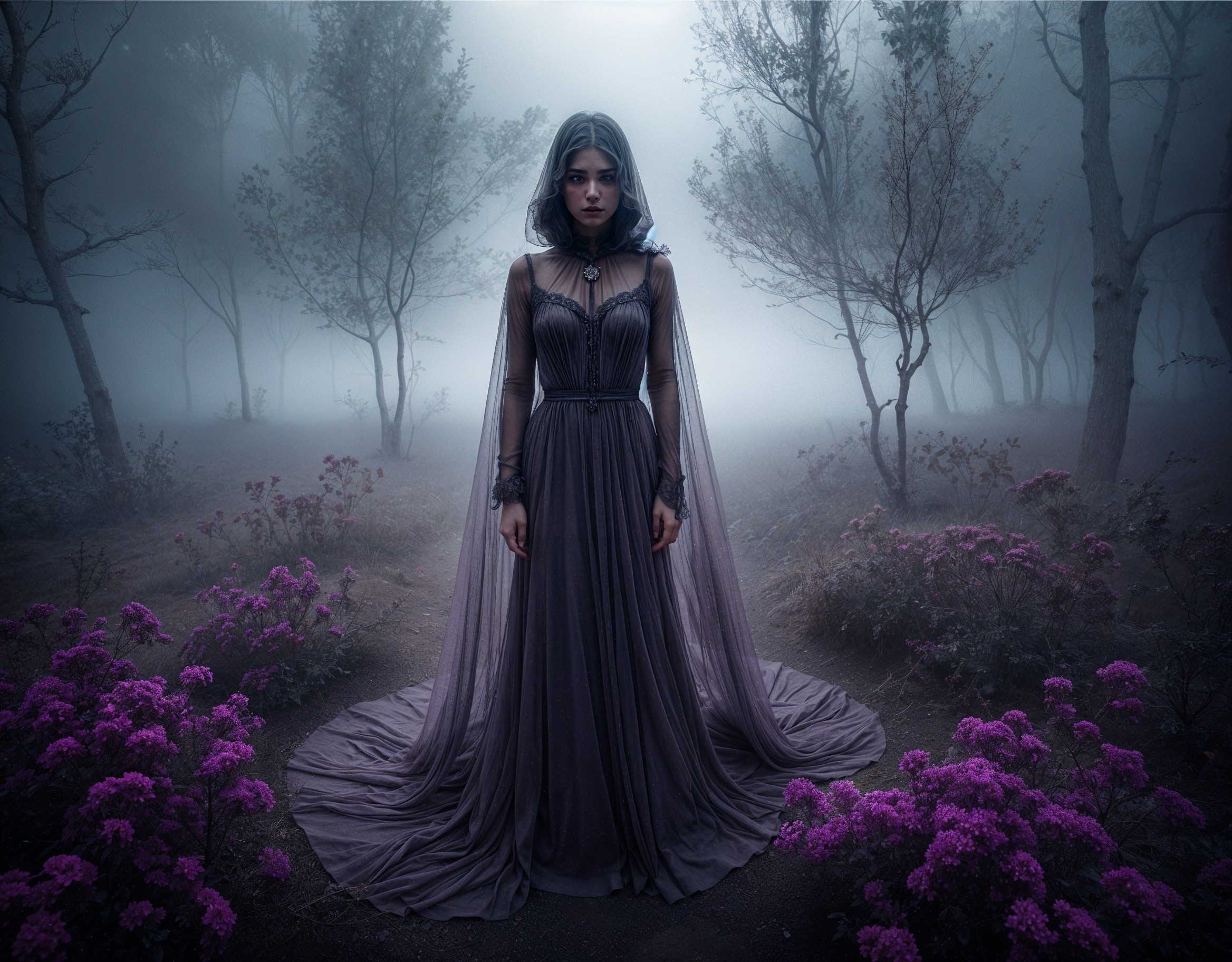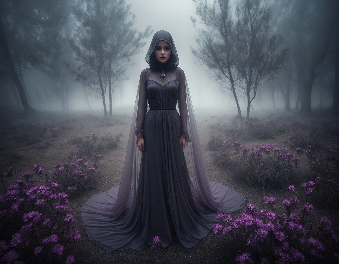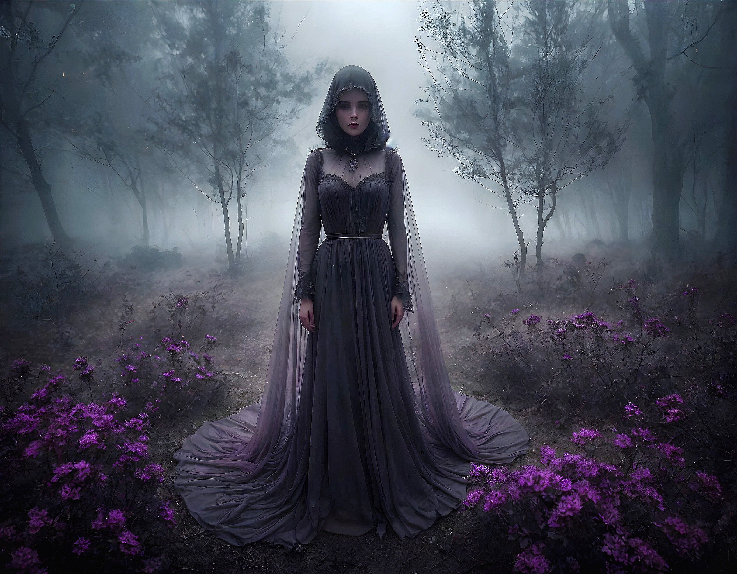 A mysterious figure stands in a foggy forest, draped in a flowing dark gown and hood. Surrounding her are vivid purple flowers, enhancing the ethereal and enchanting atmosphere.