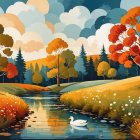 A serene landscape featuring golden autumn trees by a tranquil river, reflecting majestic snow-capped mountains and a bright moon under a clear blue sky. Perfect harmony of nature’s beauty.