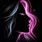 A striking profile of a woman with vibrant pink and blue hair. Her glossy lips and dramatic eye makeup enhance her captivating look against a dark background, creating a bold and artistic vibe.