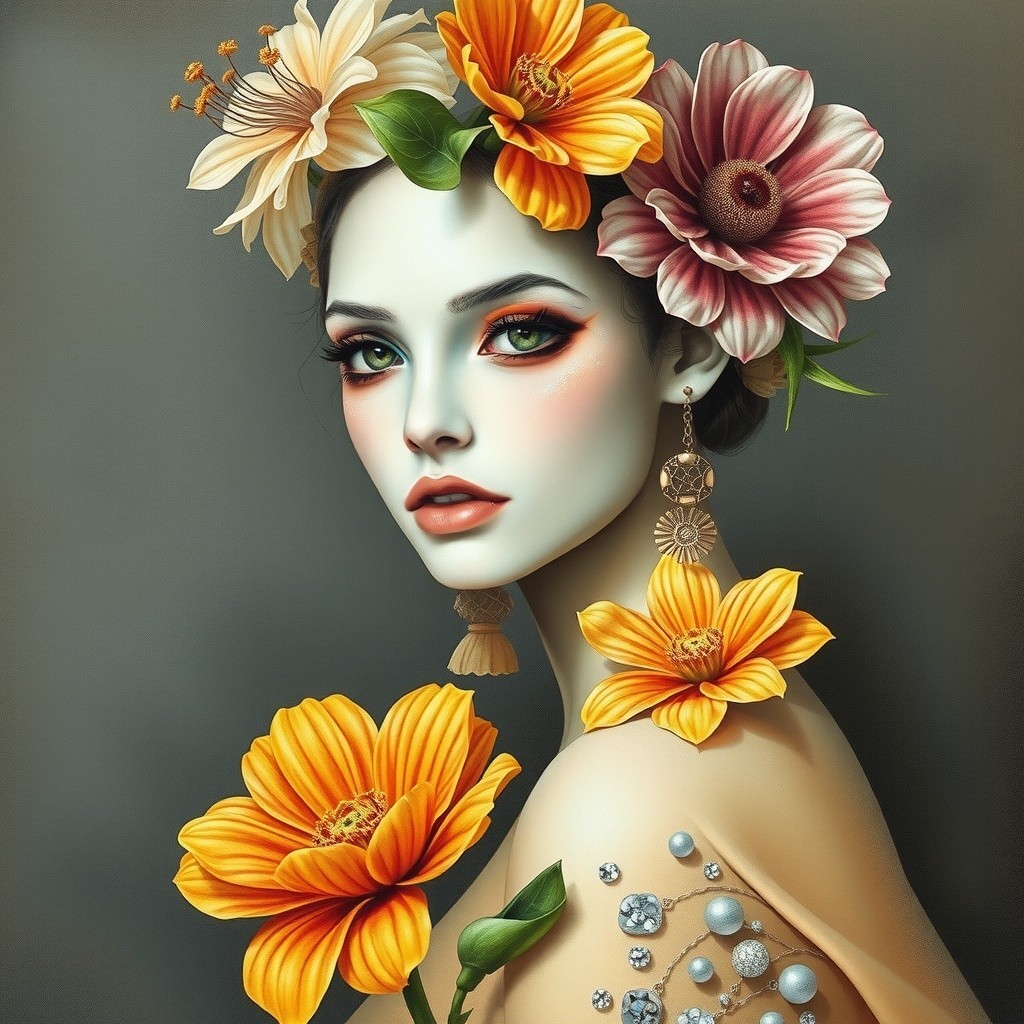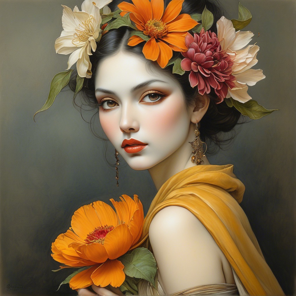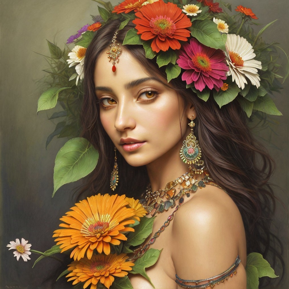 A young woman with flowing black hair adorned with vibrant flowers. She holds an orange flower close, her expression serene, complemented by elegant jewelry and soft, glowing skin.