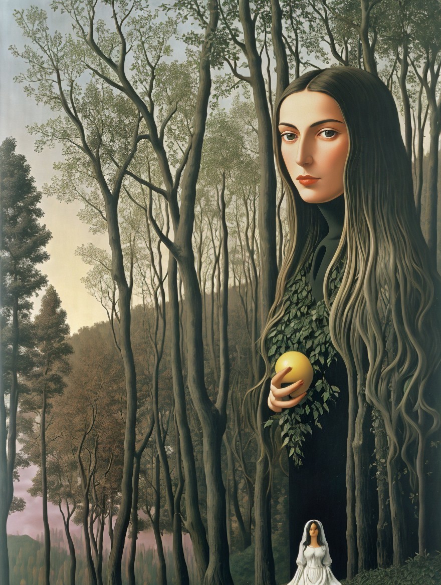 A woman in a black cloak holds a white sphere in a bare, autumnal forest.