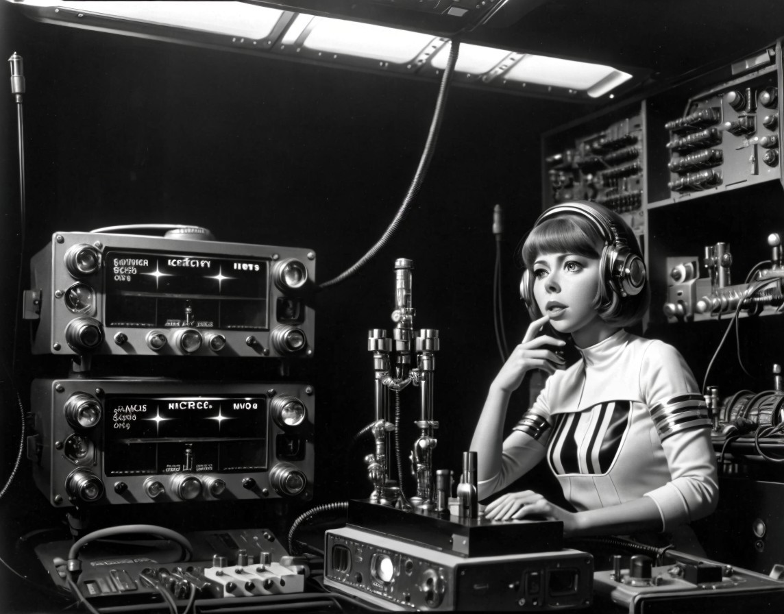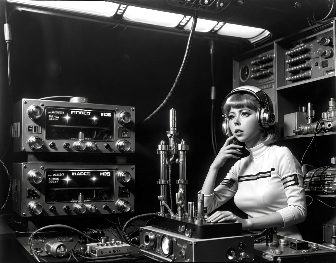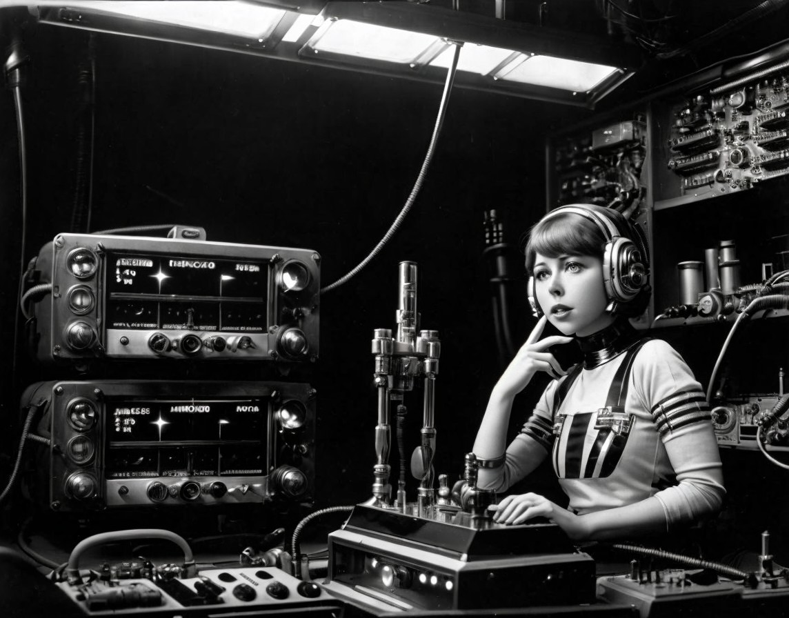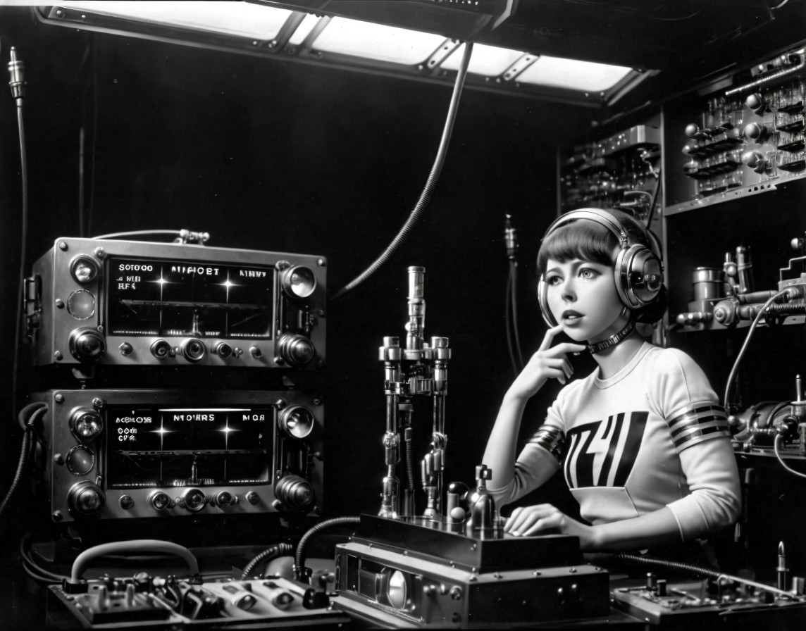 A scene from a 1970 science fiction movie, black and white, daguerreotype, sci-fi, circuit boards, tubes,cables, dirt, an actress looking like Janette McCurdy in a vintage space suite