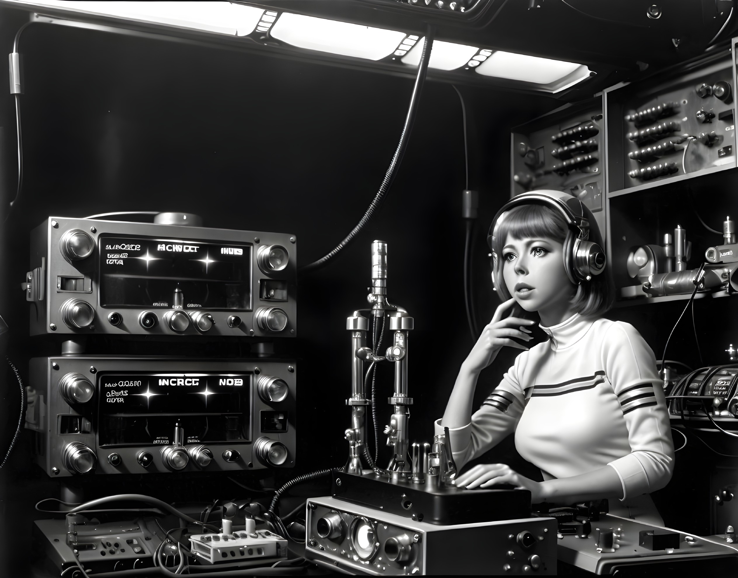 Prompt: A scene from a 1970 science fiction movie, black and white, daguerreotype, sci-fi, circuit boards, tubes,cables, dirt, an actress looking like Janette McCurdy in a vintage space suite