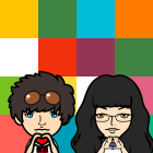 Two animated characters sit side by side, wearing sunglasses. One has blond hair and a colorful shirt, while the other has black hair and a yellow top. A drink with whipped cream is nearby.