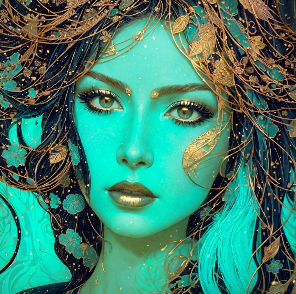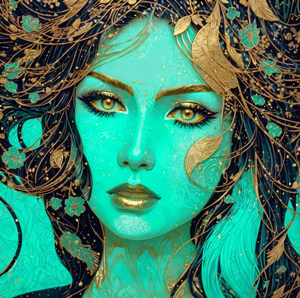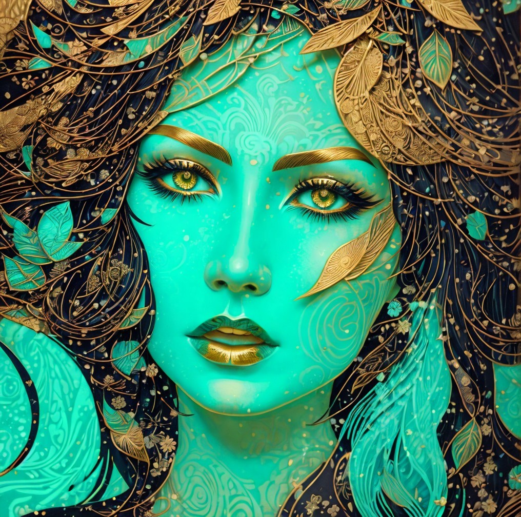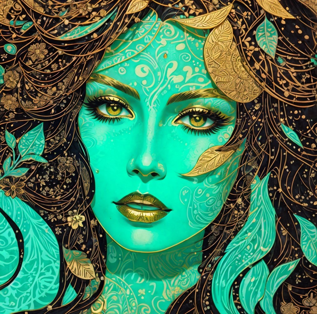 The image features a vibrant, mystical woman with intricate designs on her face. Her green skin contrasts beautifully with golden details, surrounded by elegant leaves and floral motifs.