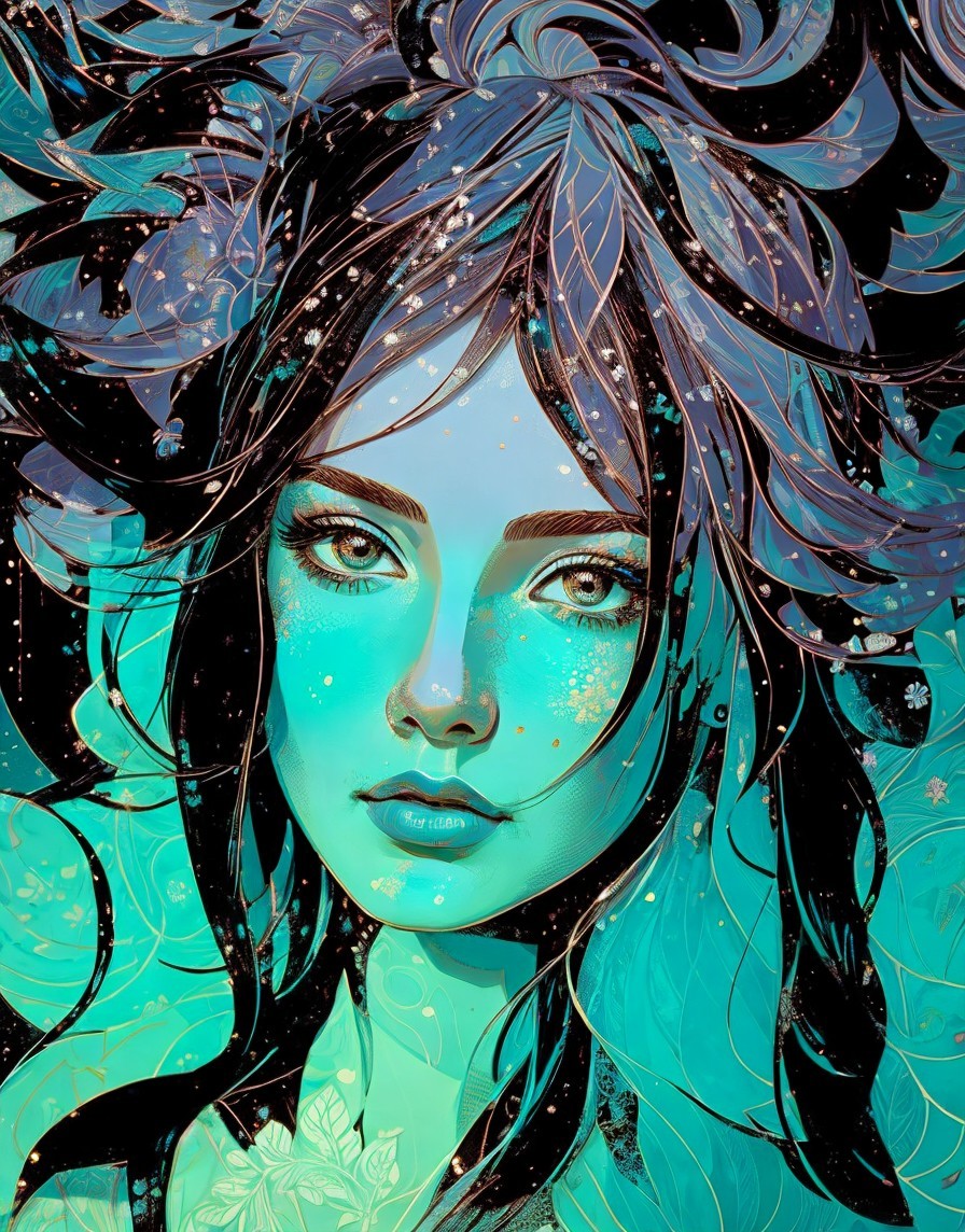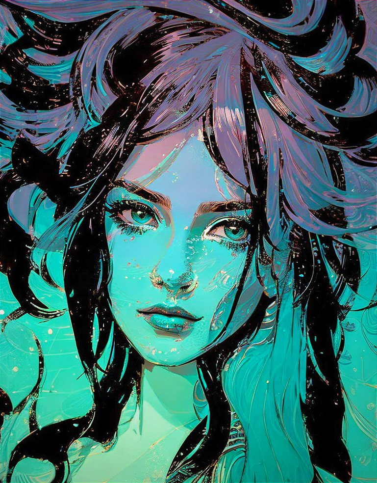 + Prompt:Very stylized headshot portrait featuring a enchantress in swirling patterns in a variety of filaments and eaves, woodblock print, immersed warm tones like teal and blue. Dimmed lighting, delicate depiction, stylized hairstyle, visible brushstrokes, reminiscent of space age style, sprayed paint details, close-up,3 layers of dof surrounded by ethereal, flowing patterns that resemble wisps of fabric. The background includes a forestal scene with glowing leaves and cel-shaded forms, visual depth and mystery. The entire composition radiates actioning and fluidity, blending natural elements with a dreamlike atmosphere. Style of Margaret Keane, Remedios Varo, John buscema, curttis Cole, frank miller. Semi-surreal,dethereal, fiampunk, forestcore, anisotropic filtering 1.7, raytraced shadows 1.2, diffused lighting, blurry edges effect,Byzantine face type, reminiscent of FrankMcCarthy and Overton Lloyd and Art Nouveau style.