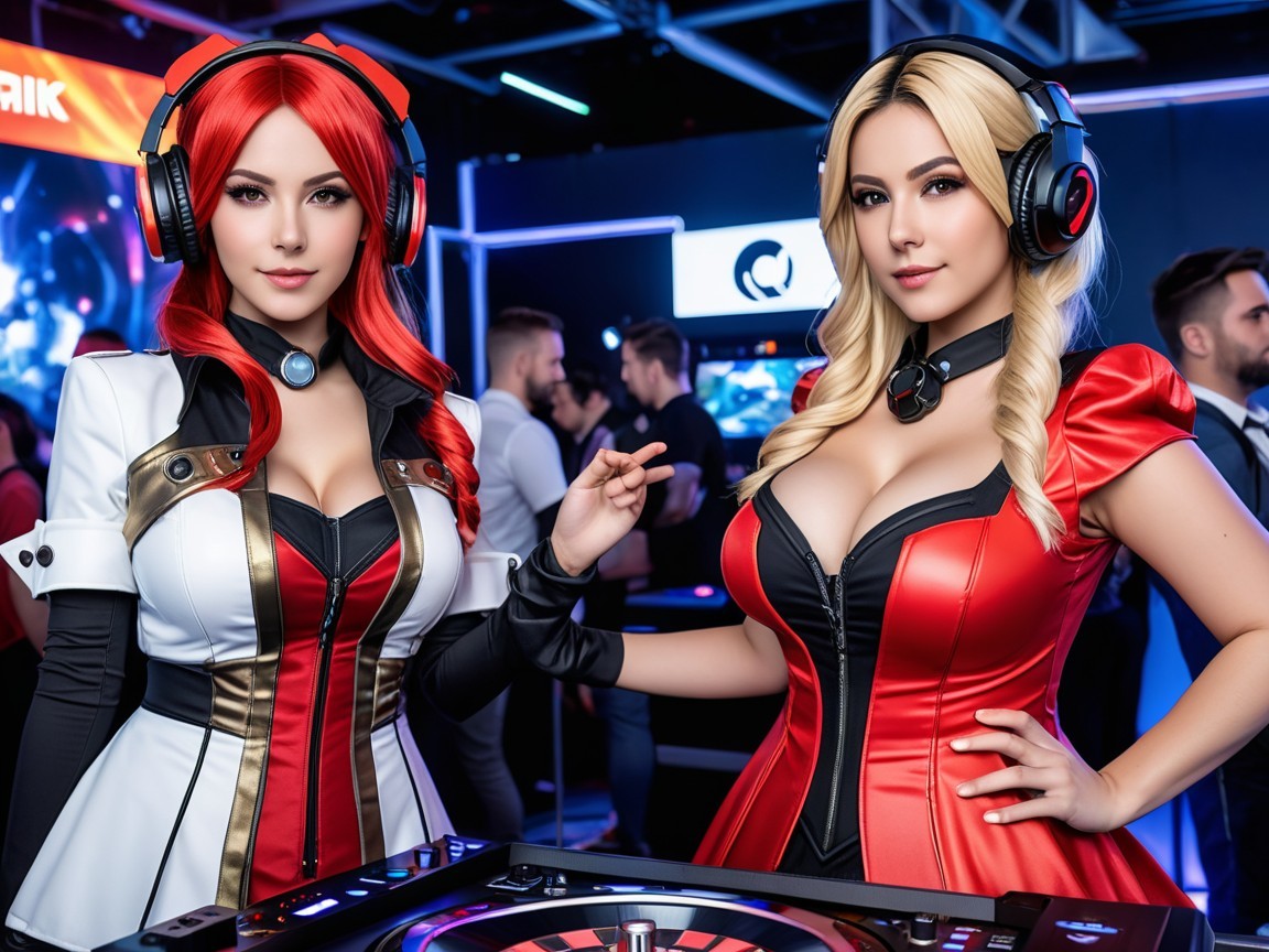 Two women in vibrant fox-themed outfits with cat ears and headphones stand confidently at a gaming event, engaging with each other amidst a lively, tech-filled background.