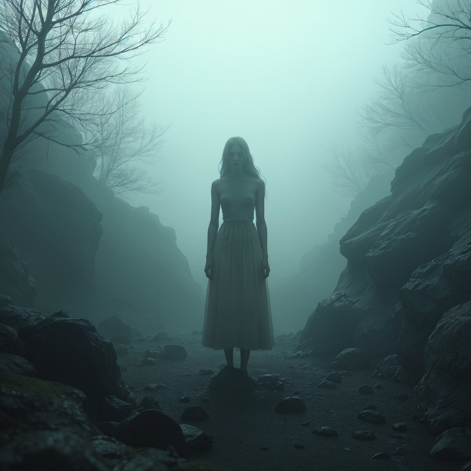 A mysterious figure in a flowing, muted dress stands in a foggy landscape, surrounded by barren trees and rocky terrain, evoking a sense of solitude and otherworldliness.