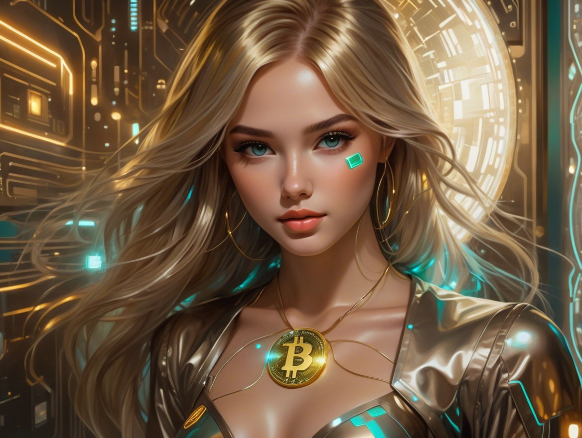A stylish woman with long blonde hair gazes confidently at the viewer. She wears a futuristic outfit and a Bitcoin pendant, set against a high-tech, glowing background.