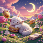 A dreamy landscape features a fluffy white kitten playfully napping beside giant macarons, colorful lollipops, and steaming cups of tea under a crescent moon and pastel clouds.