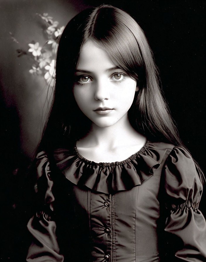 A young girl with long dark hair stares intently at the viewer. She wears a vintage black dress with a frilled collar, set against a soft, floral background. The image has a moody, timeless quality.
