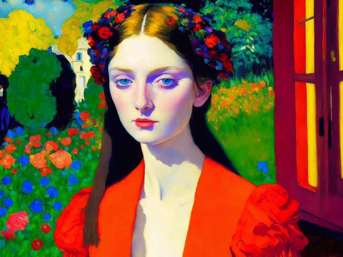A young woman with bright blue eyes and red hair adorned with flowers, wearing a vivid red top, looks back at us, against a garden backdrop of greenery and colorful blooms.