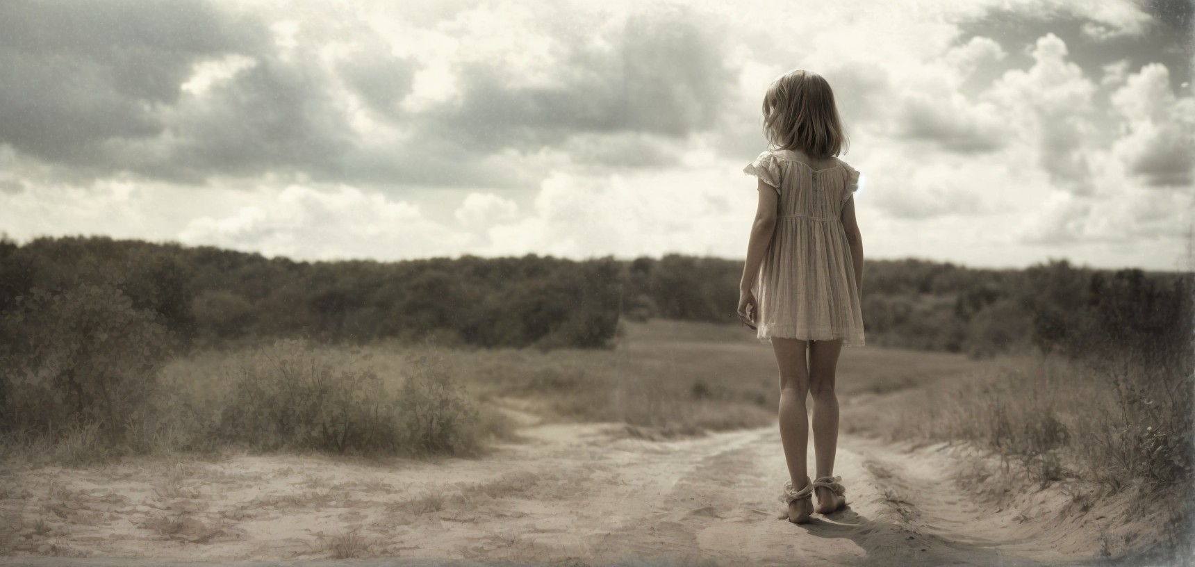A woman in a white dress stands on a sandy path amidst dunes under a cloudy sky, looking towards a forest in the distance.