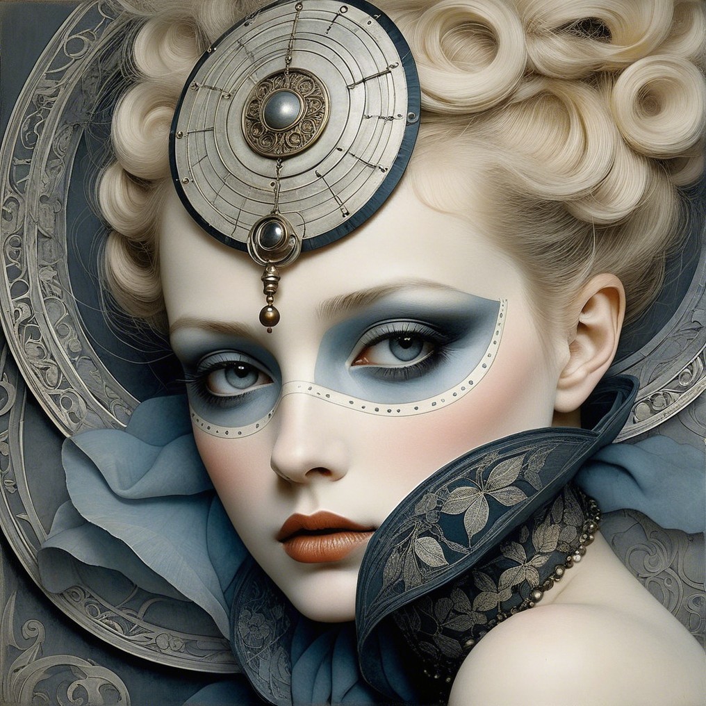 A striking portrait of a young woman with elegant blonde hair and a smoky eye look. She holds a cigarette, exuding an air of sophistication and mystery, framed by delicate lace.