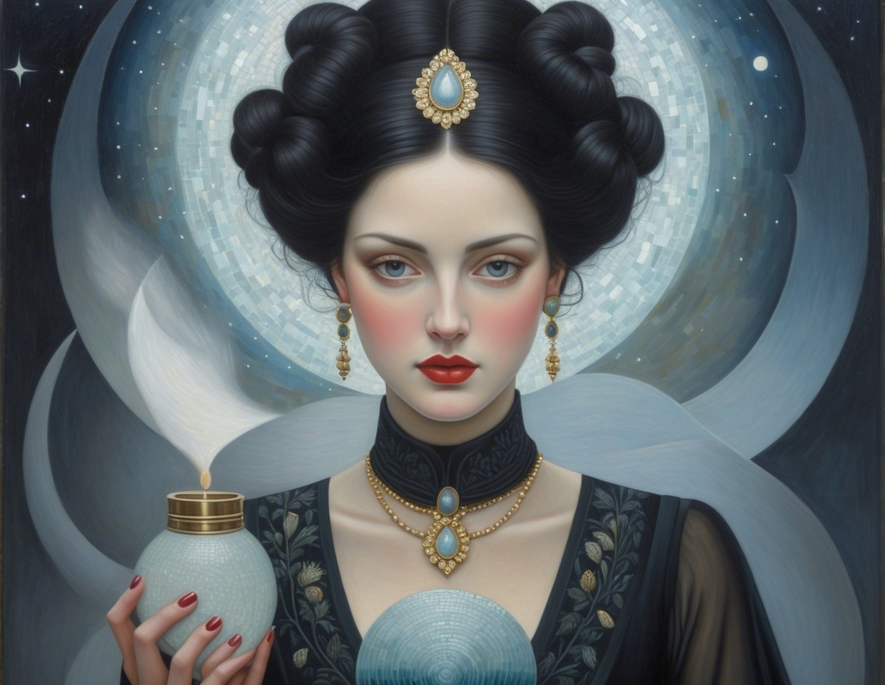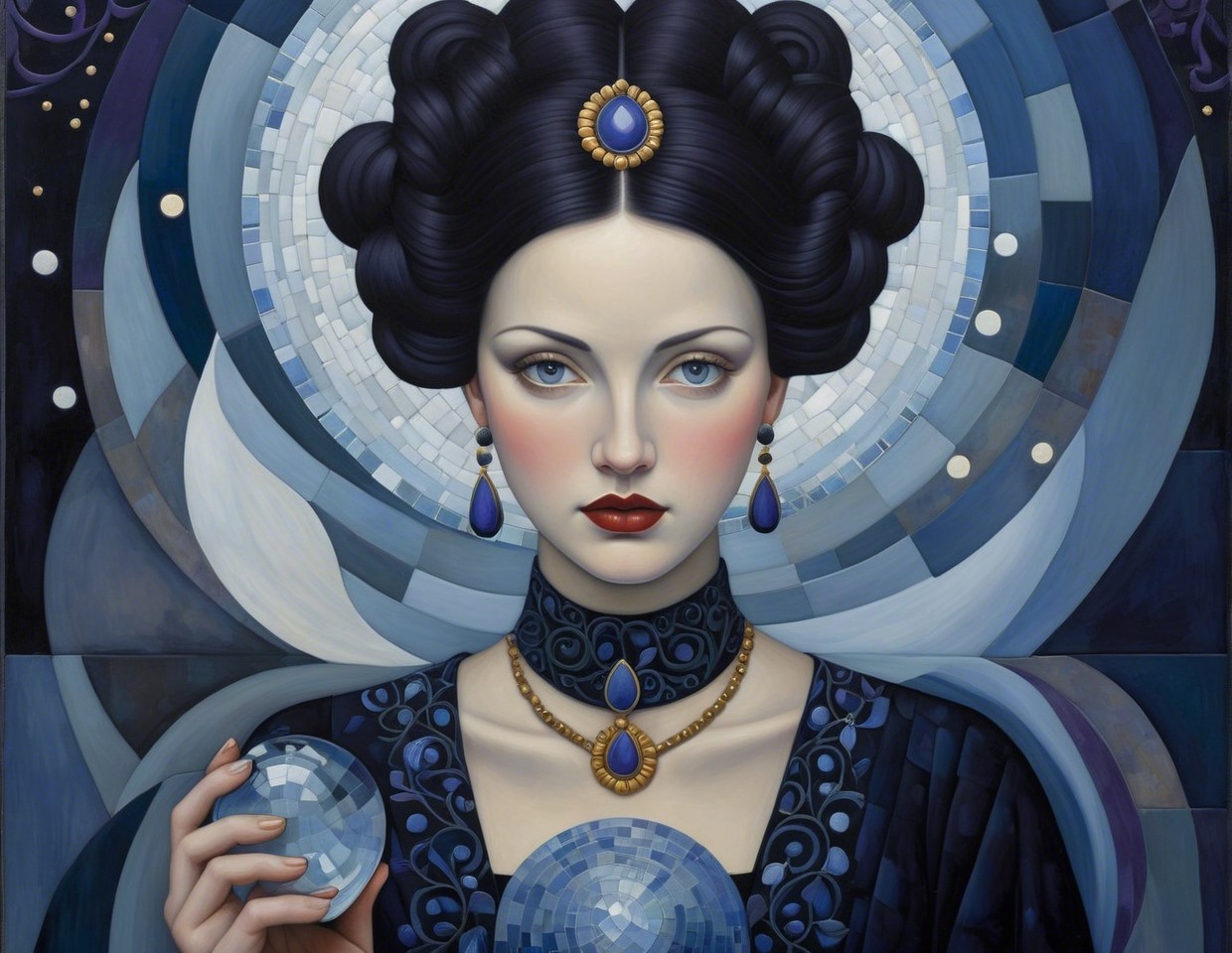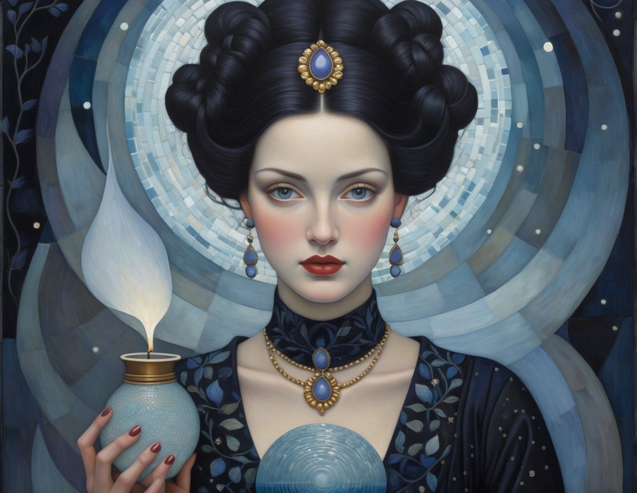 A serene portrait of a woman adorned with intricate details, surrounded by blue tones and lotus flowers. Her expression is calm, complemented by elegant jewelry and a mystical background.