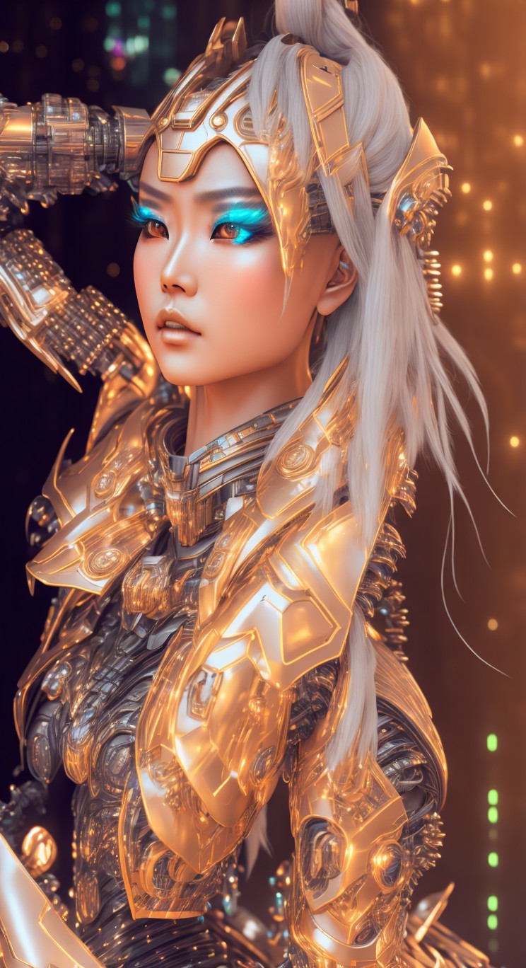 A humanoid armored futuristic female cybernetic samurai with glowing neon decals