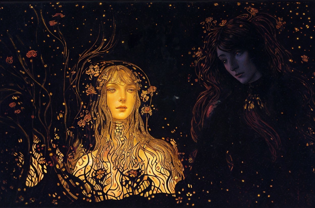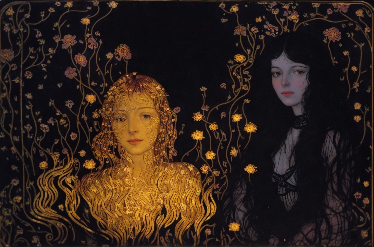 + Prompt:Portrait of a beautiful Woman surrounded by fiery flowers, fire flowers, flowers made of fire, flowers made of flame, embossed gold, gilded, metallic gold.