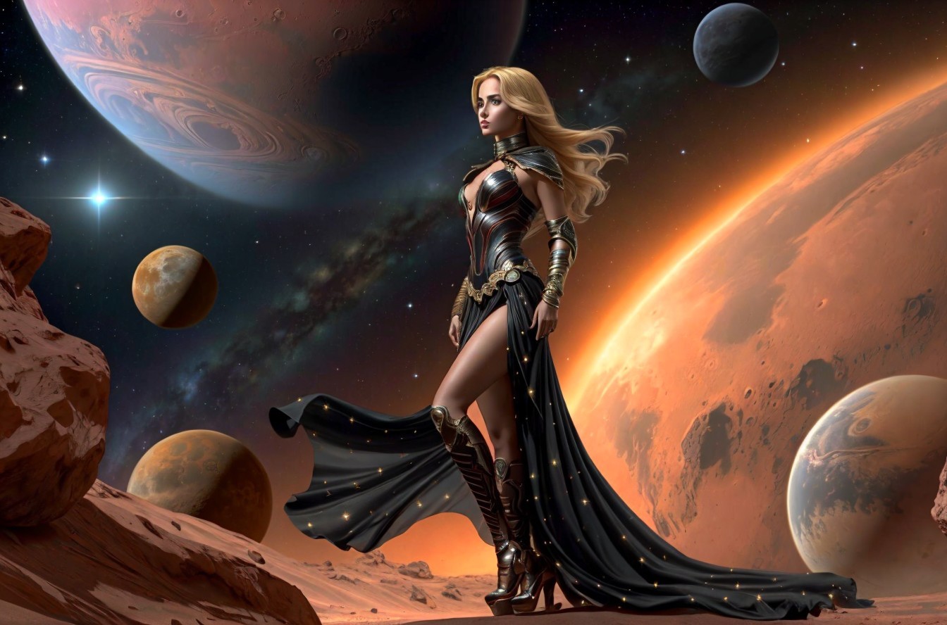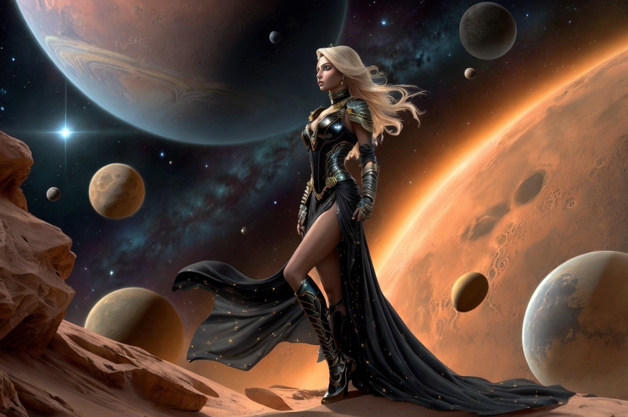+ Prompt:Scorpio Lady on the background of the planets Mars and Pluto, clearly worked out details, clearly drawn hands, clearly drawn face, super crisp quality, highly detailed, ultra-clear image, ultra-confusing, ultra-pronounced detail, sensuality