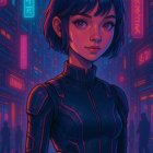 A futuristic cityscape glows with neon lights, featuring a cyborg woman in sleek armor. The vibrant colors and tall buildings create an immersive, cyberpunk atmosphere.
