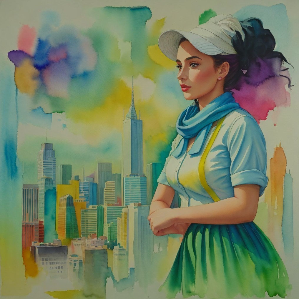 Colorful watercolor illustration of stylish woman in yellow jacket and blue cap in vibrant cityscape.