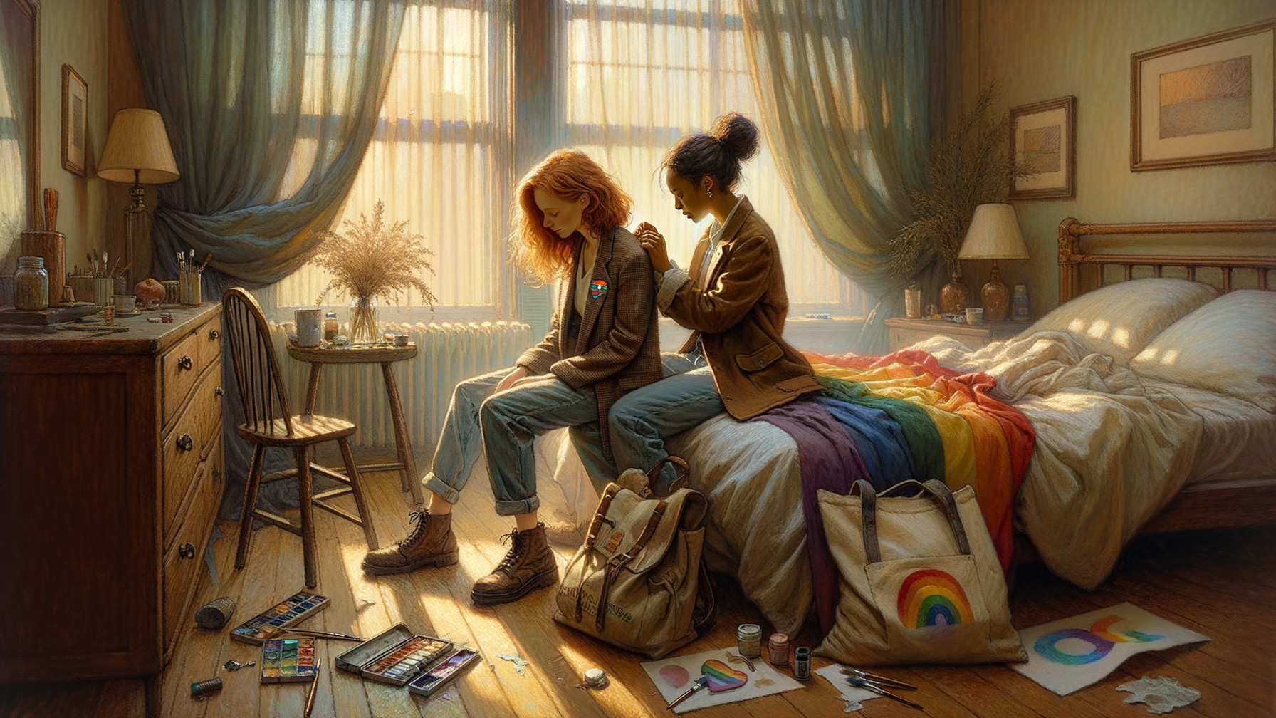 In a cozy, sunlit room, two young women share a tender moment. One comforts the other, surrounded by art supplies and a colorful rainbow blanket draped over the bed, reflecting creativity and warmth.