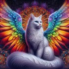 A majestic white cat with vibrant, rainbow-colored wings sits gracefully against a cosmic background, exuding an aura of elegance and mystique, surrounded by intricate patterns.