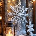 A beautifully arranged winter scene features a large snowflake within an ornate wooden frame, surrounded by snowy branches, soft lights, and candles, creating a cozy, festive atmosphere.