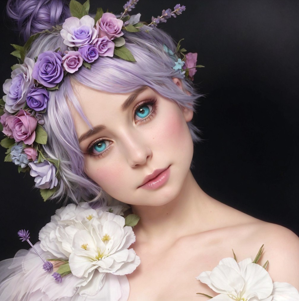 + Prompt:Cute fairie with short white hair wearing a flower crown of lavender roses and eyes made up with turquoise shadow, and lavender Iipstick Aka Jean-Baptiste Monge.