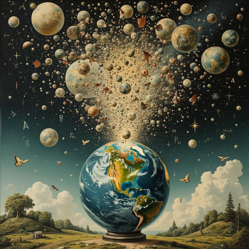 The artwork features a surreal depiction of the Earth at the center, surrounded by intricate celestial spheres and planets, with enigmatic figures and trees, portraying a cosmic connection.