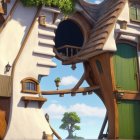 A whimsical, slanted house with a green door and wooden accents, set in a lush landscape. Its unique architecture features rounded windows and a cozy, inviting vibe, surrounded by nature.