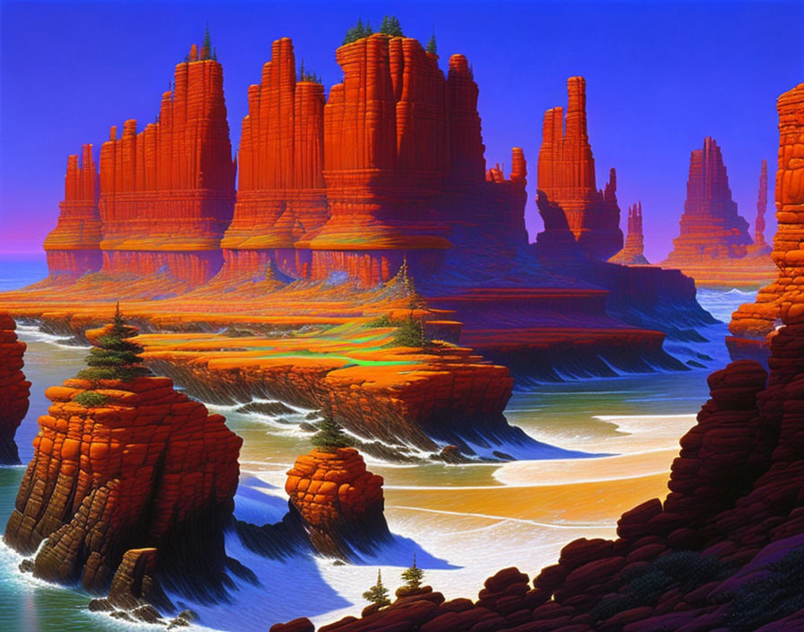 Red rock formations, sailboat on turquoise waters, sandy beach, lush green trees
