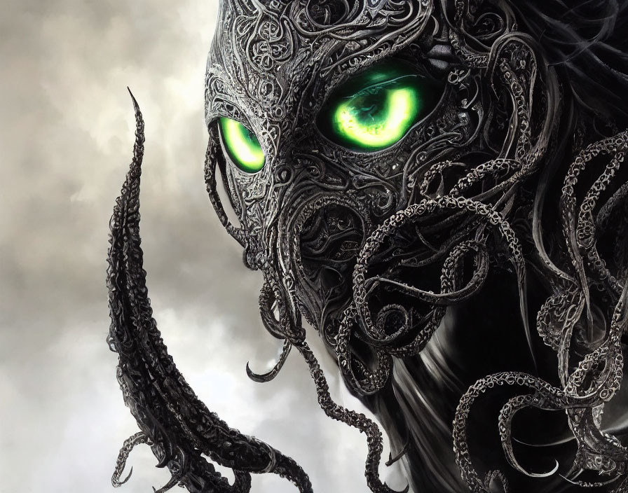 Detailed creature with green glowing eyes and black armored surface among twisting tentacles.